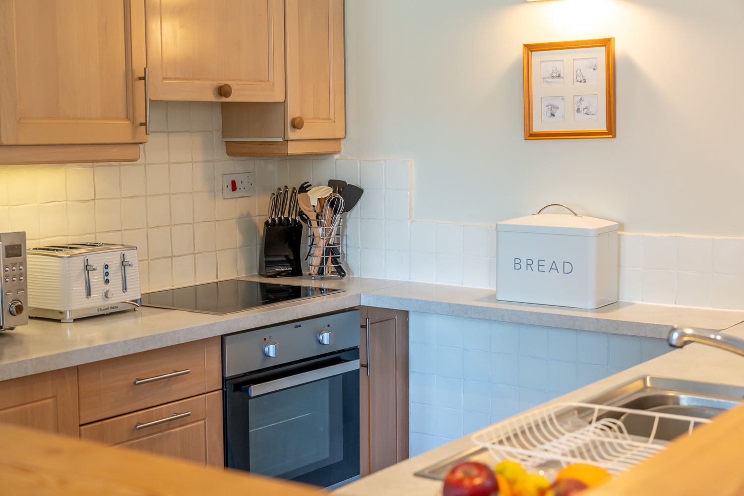 - The fully equipped kitchen has an electric hob and oven, microwave and fridge with small freezer compartment. There is also a larger shared freezer in the laundry room adjacent to the cottage.